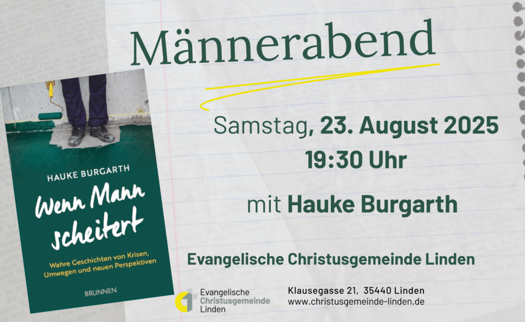 Herzliche Einladung zum Männerabend am Samstag, den 23. August um 19.30 Uhr in der Ev. Christusgemeinde, Klausegasse 21, 35440 Linden-Leihgestern. Bringt eure Freunde mit!